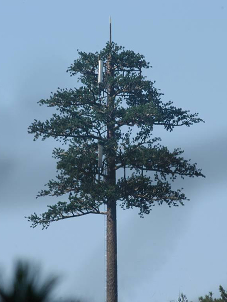 仿生樹,又叫仿生塔、仿生通訊塔,屬于通信發(fā)射塔技術(shù)領(lǐng)域。是讓通信鐵塔與周圍的自然環(huán)境相協(xié)調(diào),有效地解決了風(fēng)景區(qū)等地建站難的問題,其優(yōu)點(diǎn)是保持了原有單管塔的所有優(yōu)點(diǎn),在其外形上作了重大的突破、改進(jìn),以自然生長(zhǎng)的松樹,樟樹等為仿真的造型樣本,設(shè)計(jì)素描圖和電腦效果圖,制訂雕塑和噴涂工藝程序,對(duì)單管塔仿真?zhèn)窝b,使人們察覺不到塔的存在,把它融入了周圍的自然環(huán)境中。