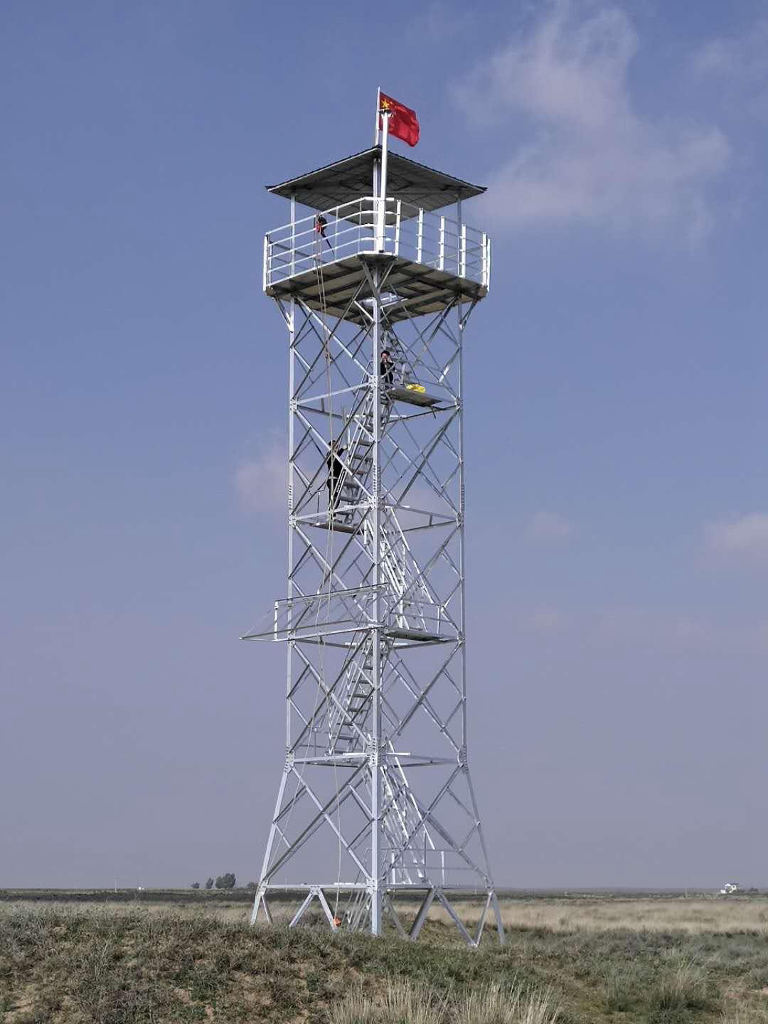 瞭望塔結(jié)構(gòu)一般為鋼結(jié)構(gòu)塔架,拆、裝方便。平面為四邊形自立式或拉線式。主體曲線一般為折線形,內(nèi)部結(jié)構(gòu)為交叉式。上部設(shè)工作平臺或值勤房。內(nèi)部設(shè)有斜向爬梯或旋轉(zhuǎn)爬梯。